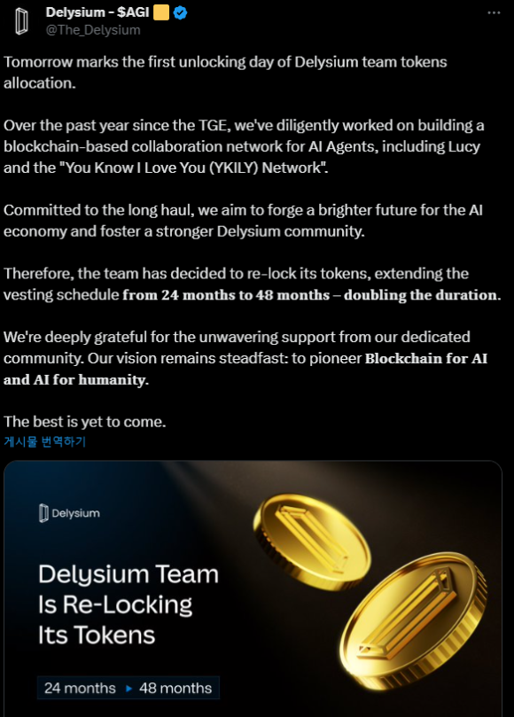 팀은 토큰을 다시 잠그고 귀속 일정을 𝐟𝐫𝐨𝐦 𝟐𝟒 𝐦𝐨𝐧𝐭𝐡𝐬 𝐭𝐨 𝟒𝟖 𝐦𝐨𝐧𝐭𝐡𝐬 ~ 𝐝𝐨𝐮𝐛𝐥𝐢𝐧𝐠 𝐭𝐡𝐞 𝐝𝐮𝐫𝐚𝐭𝐢𝐨𝐧 까지 연장하기로 결정했습니다.