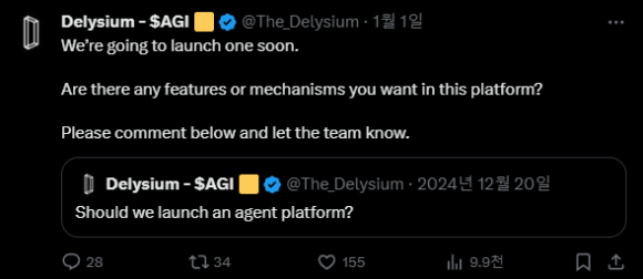 지난 1월4일 델리시움은 트위터를 통해 AI에이전트 플랫폼 출시 떡밥을 던졌다.(1월1일에도 언급하긴 했다) 물론 실제로 출시가 되어야 하겠지만 기대감을 심어주기에는 긍정적인 메시지로 보이며 지속 팔로업 해보려고 한다.