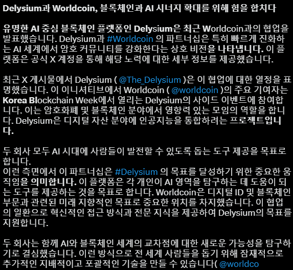 지난해 8월 델리시움은 월드코인과 파트너십을 체결했다. 이 파트너십이 두 프로젝트에 어떤 시너지가 있을지 잘 모르겠으나, 같은 섹터의 두 프로젝트가 같은 방향을 바라보고 협력하겠다는 것은 긍정적으로 볼 수 있다. 다만, 이 후 어떤 협업이 있었는지 구체적인건 나온게 없다.